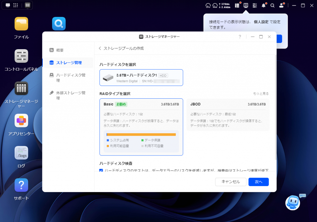記載の通り、データを消さずに、後からRAIDレベルがが変更できます。もちろんRAIDなし(Basic)からのRAIDレベル変更もできました。とりあえずHDD1本で使い始めて、2本でRAID1、3本でRAID5、4本でRAID5/6と変更することができます。