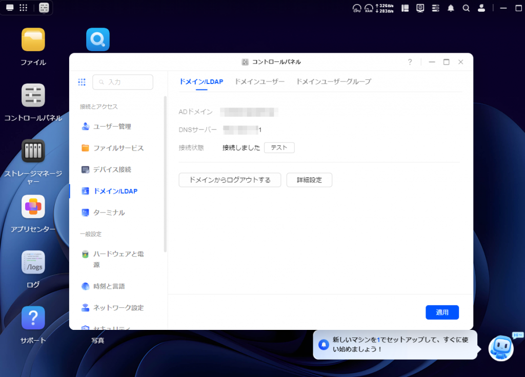 コントロールパネルからドメイン/LDAPを選んで設定できます。スクリーンショットはAD設定済みです。設定前のスクリーンショットは忘れた。